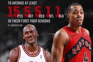 历史唯二!猛龙官方:巴恩斯生涯前4季场均15+5+5+1+1 比肩乔丹