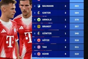 德甲现役球员出场数排行:诺伊尔527场居首,基米希、磁卡进前10