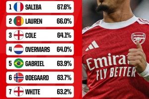阿森纳球员英超胜率榜:萨利巴居首,加布里埃尔、厄德高在列